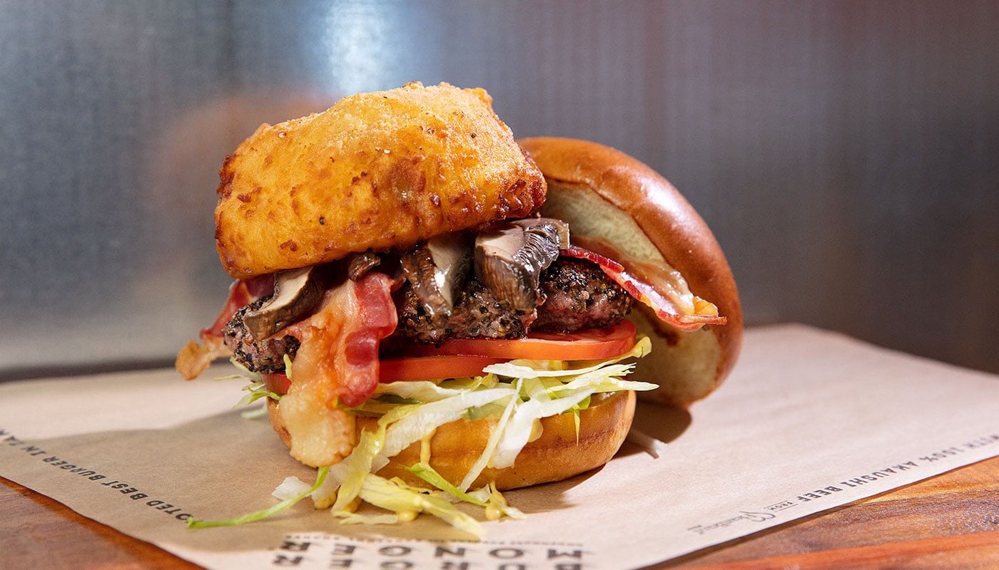 PEPPER CRUSTED BURGER WITH LETTUCE, TOMATO, BACON, SLICED GRILLED MUSHROOMS, A HOUSE BATTERED ONION RING AND DIJON MUSTARD.