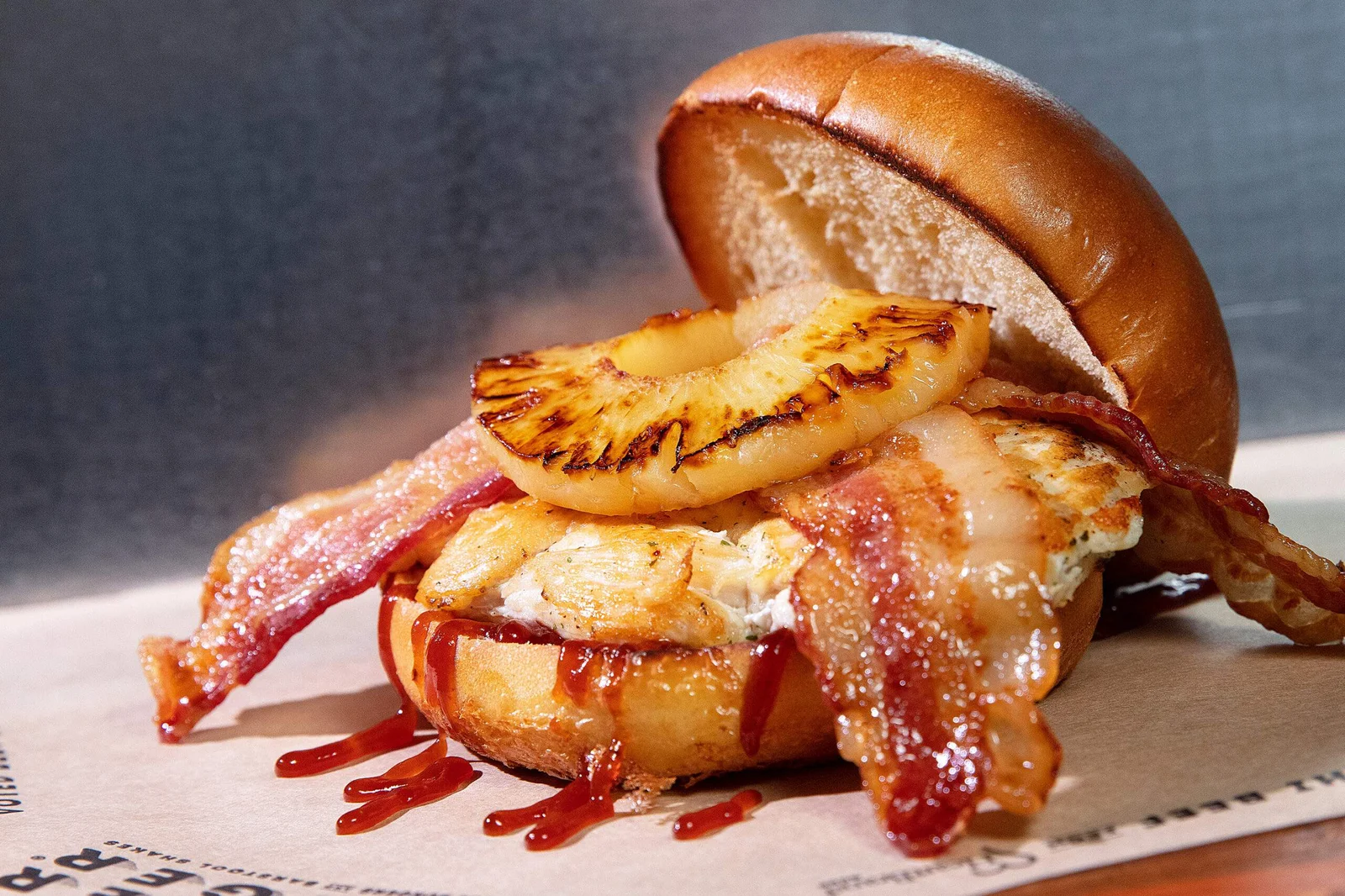 GRILLED PINEAPPLE SLICE, CENTER CUT BACON AND SWEET BABY RAYS® BBQ SAUCE.