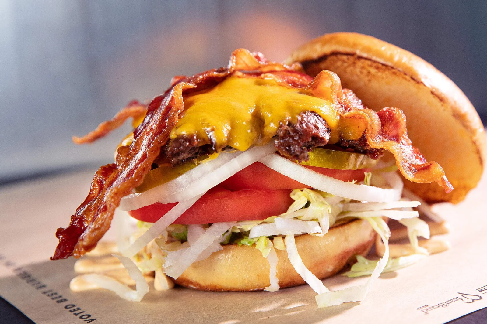 TWO SLICES OF AGED CHEDDAR AND STRIPS OF CENTER CUT BACON, LETTUCE, TOMATO, ONION, PICKLE AND MONGER SAUCE.