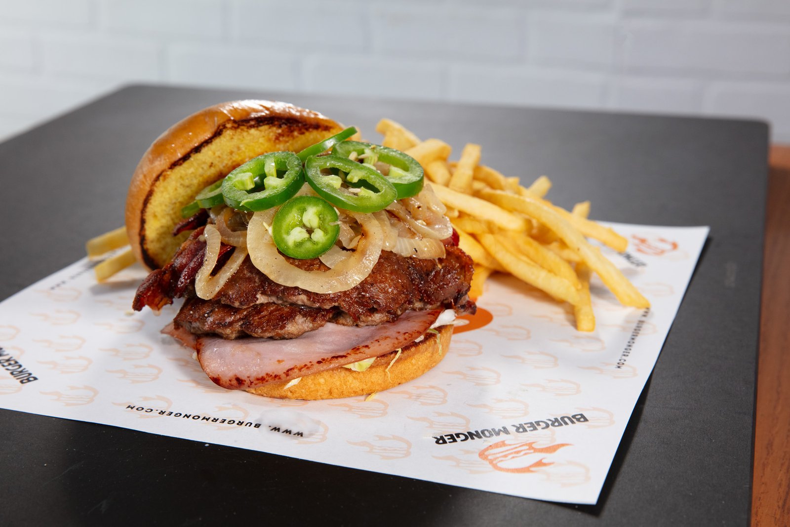 DOUBLE PATTY TOPPED WITH PROVOLONE CHEESE CENTER CUT BACON, GRILLED HAM, GRILLED ONIONS, JALAPEÑOS, LETTUCE, AND HOUSE MADE PEPPERCORN RANCH.