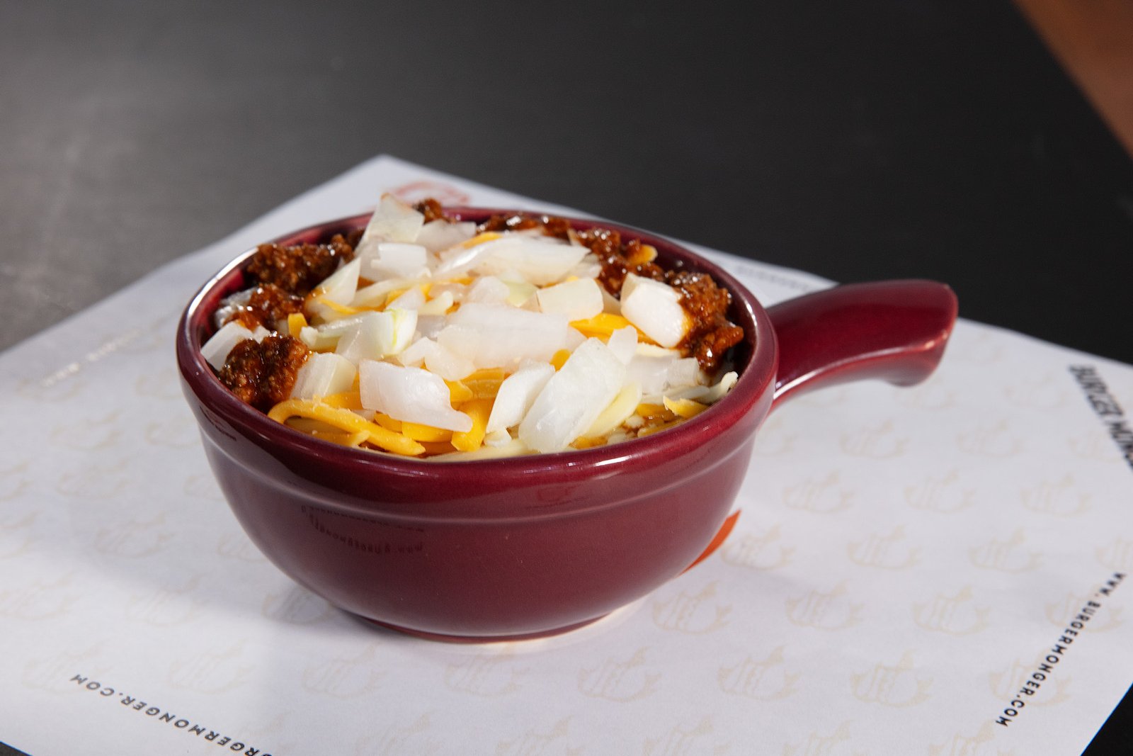 HOUSE-MADE BEEF CHILI, BACON CRUMBLES, SHREDDED CHEDDAR JACK CHEESE AND CHOPPED ONIONS.