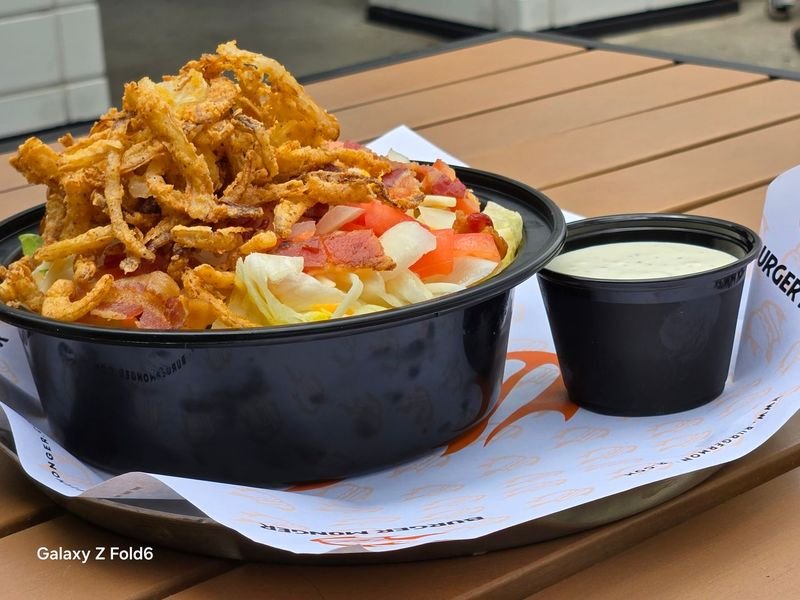 CRISP LETTUCE, CENTER CUT BACON, CHOPPED TOMATOES AND ONIONS. FINISHED WITH A HAND BATTERED ONION STRAWS AND YOUR CHOICE OF BLUE CHEESE OR RANCH DRESSING.