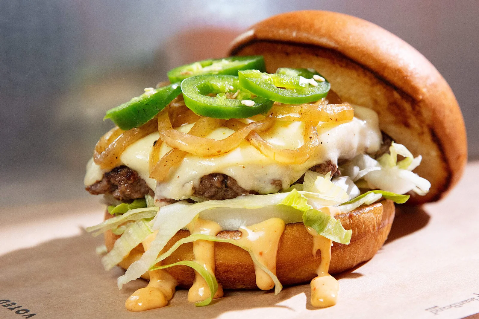 TWO SLICES OF MELTED PEPPER-JACK CHEESE, FRESH CUT JALAPEÑOS, GRILLED ONIONS, SRIRACHA MAYO, AND LETTUCE.