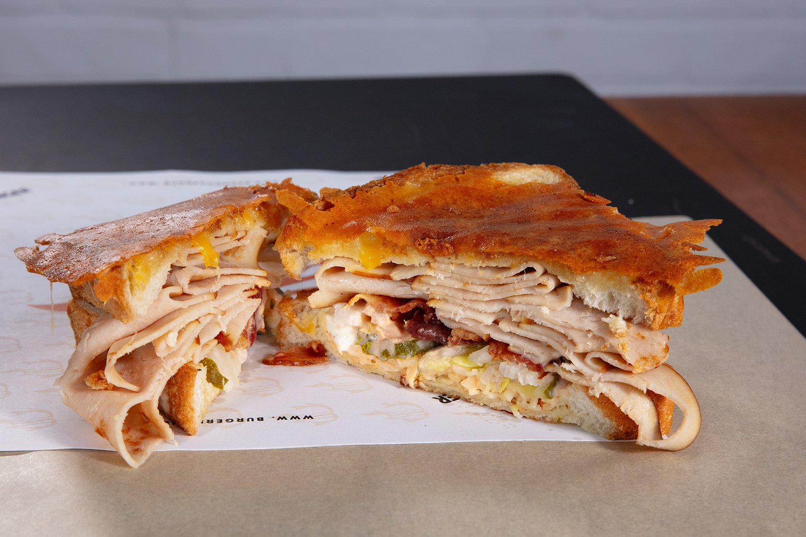 THINLY SLICED TURKEY WITH CENTER CUT BACON, PEPPER JACK CHEESE, PICKLES, ONION, SRIRACHA MAYO AND HOUSE MADE PEPPERCORN RANCH.